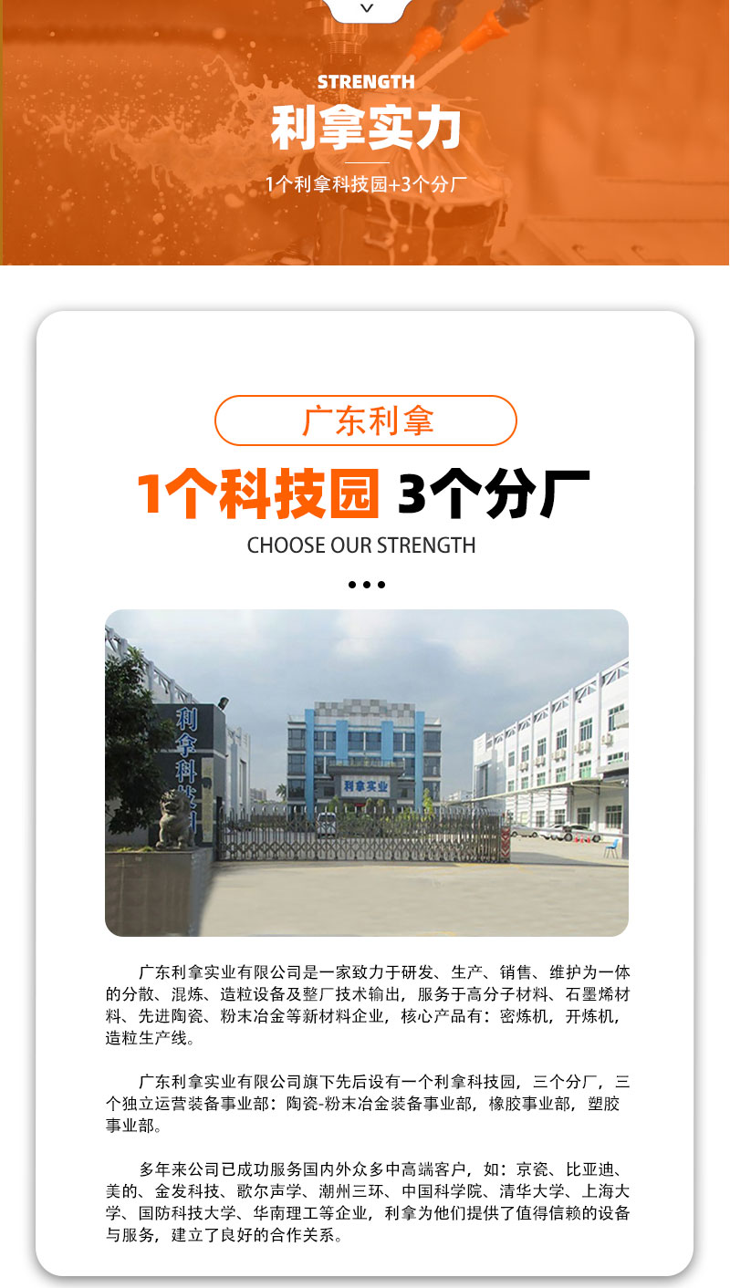 廣東利拿實(shí)業(yè)有限公司厚街分公司是一家致力于研發(fā)、生產(chǎn)、銷售、維護(hù)為一體的分散、混煉、造粒設(shè)備及整廠技術(shù)輸出,服務(wù)于高分子材料、石墨烯材料、先進(jìn)陶瓷、粉末冶金等新材料企業(yè),核心產(chǎn)品有:密煉機(jī),開煉機(jī),造粒生產(chǎn)線。